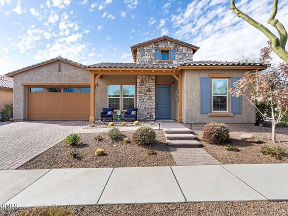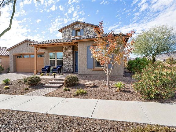 Take in the spectacular views of the mountains and the golf course! Discover the essence of luxury living with this exquisite Appaloosa plan by Taylor Morrison. From the moment you enter, you'll be impressed by the refined design and meticulous attention to detail. The open-concept design effortlessly blends the living, kitchen, and dining area all while highlighting stunning views of the White Tank Mountains. A serene central courtyard nestled within the home for complete privacy serves as an ideal retreat to reflect on your day. The gourmet kitchen is equipped with Monogram appliances, quartz countertops, and a spacious walk-in pantry. The secluded owner's suite boasts split vanities and a spacious walk-in closet offering a private sanctuary. Step outside to unwind and take in the picturesque mountains and golf course views. The luxurious landscaping includes pergola, built-in BBQ, and a gas fire pit to gather around with friends and take in the spectacular Arizona sunsets. Garage has epoxy floors, 2 overhead storage racks and built-in cabinets. Experience the charm of Verrado's small-town vibe. Experience the Victory Lifestyle!