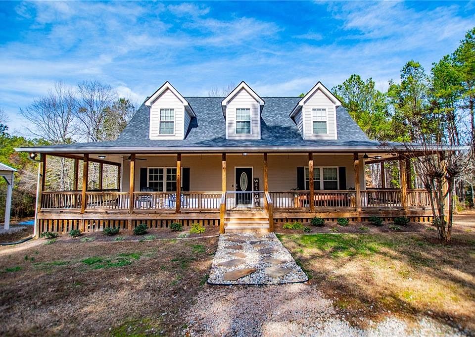 Welcome home to this spacious Cape Cod that sits on 8.63+- Acres. The interior and exterior were recently painted and a New Roof was installed. The only thing you will need to do is move in. Enjoy riding ATVs, and the great outdoors with the abundance of wildlife to watch and enjoy. The southern elegance of this wraparound porch adds extensive outdoor living for extra dining and living options. Once inside there is a large living room with a cathedral-high ceiling and, a beautiful stone fireplace with ventless gas logs. (The propane tank services the fireplace.) Large kitchen with dining area, an island for extra food prep, beautiful cabinetry, and a white farmhouse sink, stainless steel appliances, and granite countertops. You will love the large walk-in pantry to house all of your smaller kitchen appliances and food storage-Pinterest it up. On the main level is the laundry room, and the Primary bedroom suite-double tray ceiling, a spacious walk-in closet, a large soaker tub, a separate shower, dual vanities, and a linen closet. This home offers a lot of storage throughout. Upstairs there are two oversized bedrooms with large closets and extra cubbies for storage. Spacious full bath with new fixtures. Upstairs you will have a bonus room or den for the children to have their own space. The daylight basement is a walk-out to the expansive new deck. The basement could be finished for an additional bedroom or family space. There is a half bath finished. Outside you have a private oasis with an above-ground pool and a deck to enjoy those hot summer days. There is a gate entry for safety a two-car metal carport. There is additional storage underside of the porch that is secure. One hour to Atlanta Hartsfield Airport, and 35 minutes to West Point Lake. Call to schedule your appointment today. Showings to begin February 4th.
