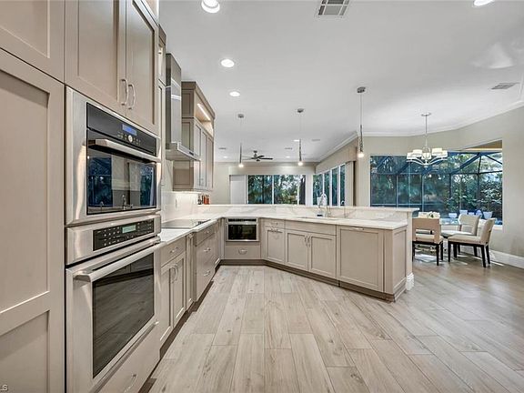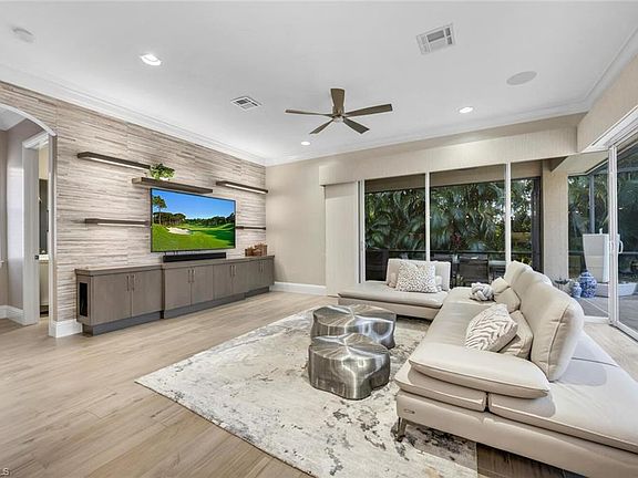 H13462 Location, Location, Location, welcome to Banyan Woods, centrally located near shopping, restaurants and A rated school district with Low HOA fees. Come and enjoy this well-maintained, upgraded home with a focus on both aesthetics and functional features. As you enter the home through a custom 10' mahogany double doors, you first get the opportunity to view the elegance of this truly upgraded home. The Living room with 13' accent tile wall with built in fire place, a Great room with custom cabinets and floating shelves with lights. Then you enter the Kitchen with custom cabinetry, Cambria quartz counter top and back splash, built in wine cooler, dual wall oven with steam, custom panel refrigerator/freezer, and dishwasher, with all Thermador appliances. Primary Bedroom has 2 sperate custom closets, Hunter Douglas Silhouettes with remote for convenience, a custom bathroom with free standing tub, separate shower, double sinks, granite counter top with cabinets for plenty of storage. Guest bedroom #1 with en-suite bathroom, Guest bedroom #2 with sperate bathroom/pool bath, and a multifunctional den/office. Plank tile flooring , 8" crown and base molding through out, plantation shutter, Hunter Douglas Silhouettes window treatments. Also featuring Control4 system, controls interior/exterior lighting, sound, television, heating/cooling with a remote and or from an app on your phone. A southern exposure private landscaped lanai with heated pool. Truly a must see.