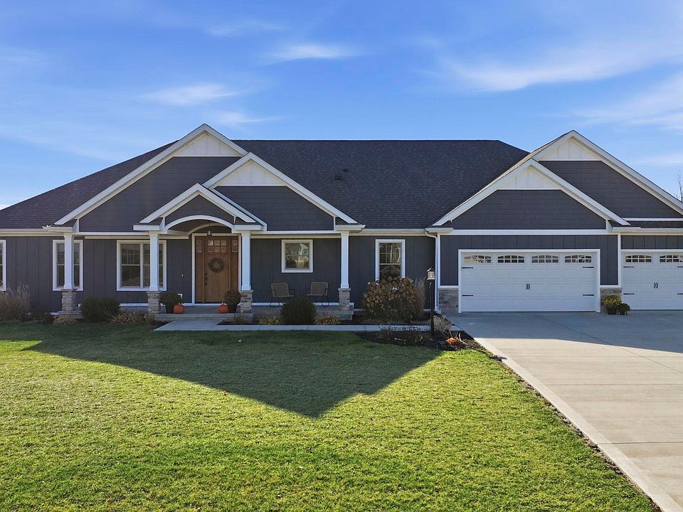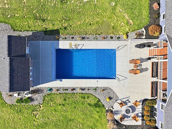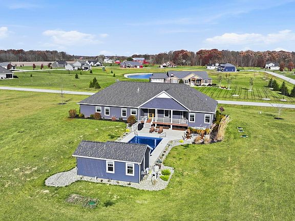 Welcome to luxury country living in the highly desired Longmeadow subdivision! This stunning 2018-built home sits on 3.7 peaceful acres and delivers resort-style amenities inside and out. Offering 4 bedrooms with a potential 5th (or office), 3 full baths plus a half bath in the pool house, this property is designed for comfort, entertaining, and everyday elegance. Step inside to an open-concept main living area with cathedral ceilings, wood-beam accents, and a cozy gas fireplace. The chef’s kitchen features a 48" commercial-grade gas range with double ovens, custom hood, quartz countertops, tile backsplash, stainless apron sink, built-in microwave, and a spacious 5'x6' walk-in pantry. French doors off the living room lead to a covered deck with a relaxing swing overlooking the heated inground pool. The split-bedroom layout includes a luxurious primary suite with a wood-trimmed tray ceiling and a spa-like bath boasting heated floors, sliding French doors, a soaking tub, 6’x6’ tiled walk-in shower with dual shower heads, double vanity, and a large walk-in closet. An attached 3-car garage provides plenty of space and includes an additional 10’x8’ storage area. Just inside, the mudroom offers exceptional functionality with a generously sized laundry space, custom built-in lockers, and a utility sink with tons of cabinet space. The daylight basement offers even more room to spread out with a large family room, full bath, bedroom, and a flexible bonus room ideal for a 5th bedroom, gym, or hobby space, plus plumbing in place for a future wet bar. Additional storage and mechanical space complete the lower level. Outside, your private retreat awaits with a heated inground pool (2021) with automatic cover, a built-in gas firepit, and a beautifully finished pool house featuring French doors, living area, half bath, and mini-split heating/cooling. The property also includes access to the stocked association pond, an invisible pet fence, a plug-in generator hookup capable of powering the home (generator not included), smart app-controlled front porch lighting, and an impressive 9' front door that sets the tone from the moment you arrive. A rare blend of modern luxury, thoughtful design, and peaceful rural charm. This home truly has it all!!