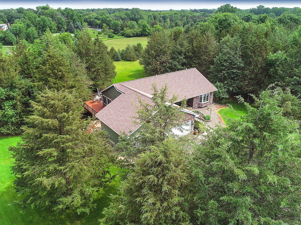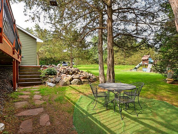 Beautifully accented w/stunning stone, fresh updates & move in ready! A man-made babbling brook flows off the 4 season porch, around the patio & under the newly installed deck w/curved metal spindles. Enjoy the private backyard that backs up to Bear Park. There's a beautiful paved walkway that leads to a private fire pit. Spot wildlife & an occasional hot air balloon! The kitchen is bright & has a casual dining space w/counter seating & is open to the main living area.