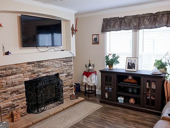 This Exceptional house with two living rooms and an amazing stone fireplace is a must see. Large open floor plan and stunning kitchen, which features a large island and gorgeous kitchen cabinets and open to both living spaces. The large master bedroom has a nice walk-in closet and spacious bath featuring a soaking tub and standup shower along with double vanities. The secondary bedrooms are spacious with large closets. Laundry room is off the kitchen and entrance to side yard. Wonderful rocking chair porch that's perfect for enjoying evenings featuring TREX decking to alleviate any maintenance worries. Large storage unit in the back yard for additional storage. This luxurious modular home resides in a community that offers ample amenities available for your use including an in-ground pool, play ground, green/space and dog park. Lot rental dues are $790.00/month and are not included in the price of the home. Owning for less than renting and convenient to I-85 and Atlanta!