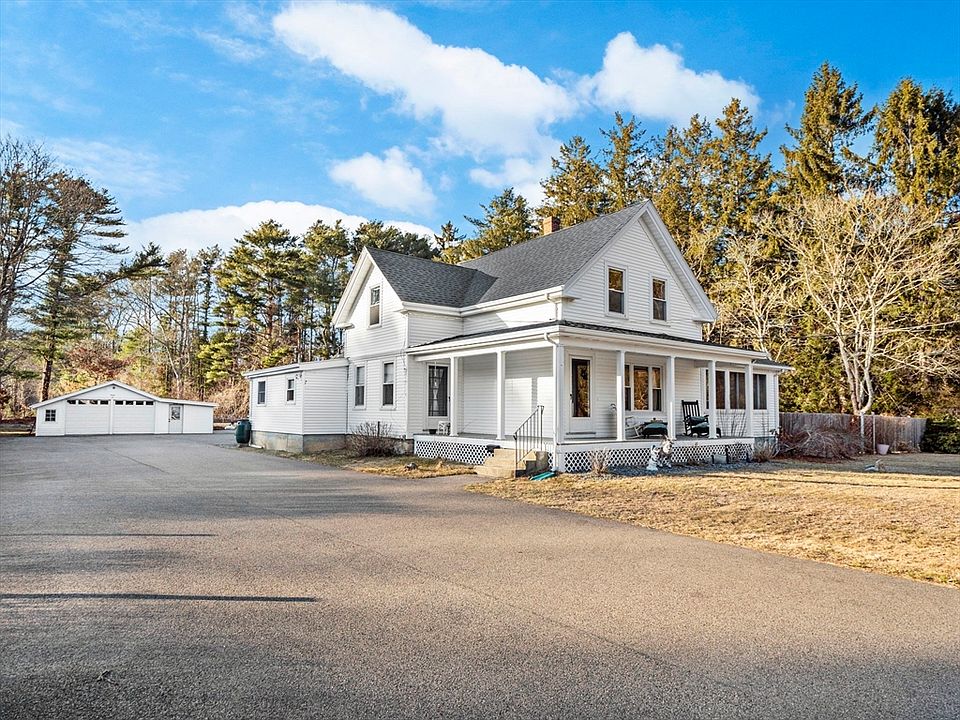 Set on a picturesque one-acre lot, this 3-4 bedroom Antique-style home blends modern upgrades with timeless charm. Recent updates include a remodeled kitchen with granite countertops, Shaker cabinets, and new appliances. The second level features a newly added full bath with heated tile floors. Both the house and garage have new roofs, and improvements like refinished hardwood floors, new laminate flooring, and added insulation enhance beauty and energy efficiency. Additional updates include a newer boiler, oil tank, hot water tank, and a French drain. The large paved driveway leads to an oversized garage for 2-4 cars, plus a workshop or extra storage. An automatic standby generator ensures peace of mind during storms. Outdoor living is equally inviting, with a large patio area and fire pit overlooking the yard-perfect for entertaining or relaxing, and a fenced-in area provides a space for pets. This property combines comfort, style, and functionality, making it an exceptional home.