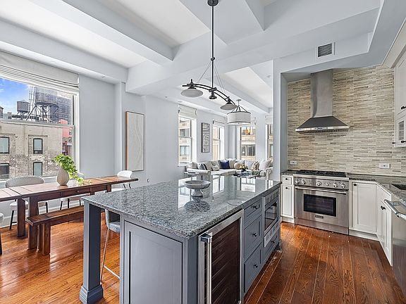 Elegant 11-foot beamed ceilings, 10 oversized windows, and a gracious open floor plan create an effortless flow between living and private spaces. The expansive 40-foot great room is ideal for entertaining, with light streaming in from multiple exposures and plenty of room for both living and dining areas. The chef’s kitchen is beautifully appointed with a large central island, bar seating, a built-in wine fridge, and generous custom cabinetry—perfect for hosting gatherings or quiet evenings at home. The flexible layout allows for a seamless conversion to a third bedroom or the continued use of this space as a formal dining room, playroom, or den, accented by custom millwork and floor-to-ceiling built-ins.