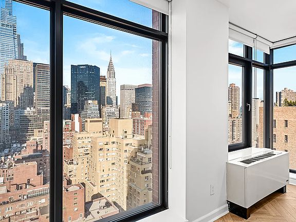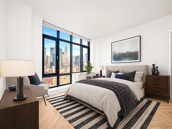 The property boasts a 24-hour doorman, a well-appointed lounge, a tranquil rooftop with panoramic city and river views, a state-of-the-art fitness center, and onsite laundry facilities. Many units feature expansive floor-to-ceiling windows offering breathtaking views of landmarks like the Empire State Building and the Manhattan skyline. In-unit washers and dryers enhance daily convenience, and intelligent design maximizes space and functionality.