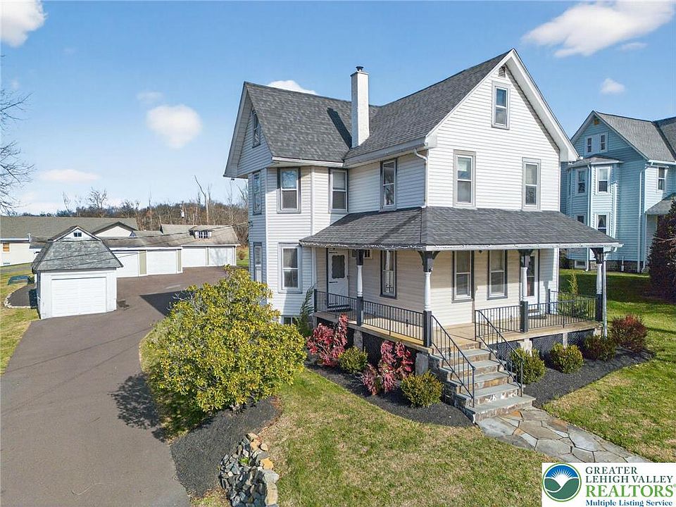 Charming Victorian residence just off the Upper Bucks Rail Trail — this four-bedroom, 1.5-bath home radiates character and warmth. The spacious main level features an inviting living room, dining area, and cozy family room, while the upper levels offer three bedrooms plus a fully finished third-floor attic space ideal for a fourth bedroom and play/hobby room. A remodeled full bath upstairs is complemented by a convenient powder room on the first floor. The generously sized lot includes multiple detached garages (six-car capacity!) — perfect for vehicles, storage, or a workshop. The basement offers additional storage and includes a pellet stove, helping keep heating costs low. Located near major routes for easy commuting and just steps from walking and biking paths, this home perfectly blends old-world charm with modern convenience.