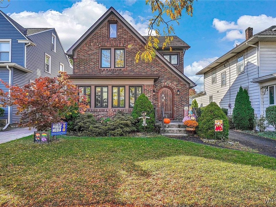 Located on one of Kenmore’s most picturesque boulevards, this stately brick Tudor revival blends timeless old-world craftsmanship with today’s modern comforts. The landscaped center boulevard sets a storybook scene, evoking the charm of a classic movie. Step inside through the elegant oval entry door and be welcomed by a tiled foyer that opens to a grand living room with gleaming original hardwood floors with inlay, a fireplace with built-in cabinets, and recessed lighting. A graceful arched doorway leads to the sunroom, filled with natural light — the perfect spot to unwind or entertain. The banquet-sized dining room features two built-in china cabinets and flows seamlessly into the updated eat-in kitchen, offering tiled backsplash, solid surface countertops, and a bright bay window. A cozy family room at the rear of the home overlooks the backyard oasis: a covered patio, heated inground saltwater pool with a retractable cover that opens with the flip of a switch. The pool has secure fencing for peace of mind. A newer two-car garage with an electric opener adds convenience. Upstairs, the beautiful original staircase leads to a spacious primary suite, featuring a walk-in closet, soaring two-story ceilings, and a loft that extends to the third floor. The suite offers abundant closet space, a whirlpool tub, and a flexible office or sitting area illuminated by a skylight. The second floor also includes three additional bedrooms and an updated full bath.