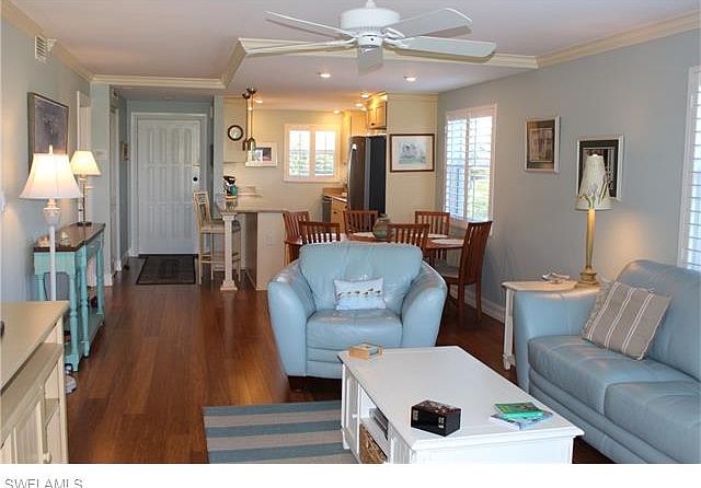 RARELY AVAILABLE END UNIT overlooking beautiful pond and golf course view. This home is Move-in ready!!! Recently remodeled throughout including new A/C unit April 2016. The custom designed kitchen features Martha Stewart cabinetry with lower pullout drawers and shelves, double tray silverware drawers. Custom design Quartz counter tops with hand made glass lighting over the counter. Upgraded Slate Gray appliance package. Custom plantation shutters, crown molding and wood flooring. High Impact Glass Windows and hurricane shutters on the lanai. The Master and Guest Baths have been remodeled with new tiled showers with glass doors, new tile flooring and vanities. Recessed lighting adds warmth and style to the living areas and baths. All work and upgrades completed by a licensed contractor. This active community offers a 9 Hole Par 3 golf course, 6 pools, Clubhouse serving lunch during season. Ample guest parking steps from your door. This is not a 55+ building.