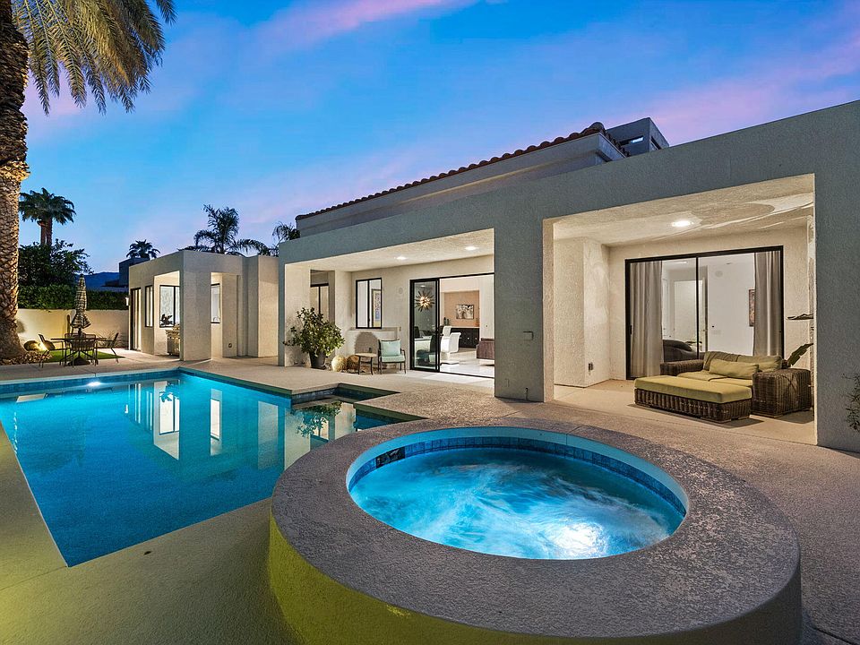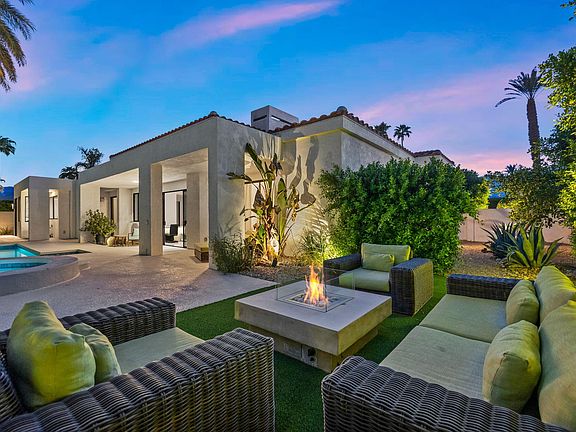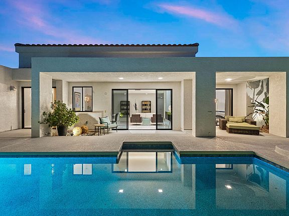 Your desert retreat awaits in Mission Pointe. This architectural modern home is one of five custom homes within Mission Palms, unlike any other in the development, and was one of the original custom homes. It features 3 bedrooms, 4 baths, and a courtyard entry on a 10,000+ sq ft lot with beautifully landscaped grounds and designer outdoor lighting. A pebble tech pool and spa are surrounded by mature palms, greenery, and generous lounge areas, creating a private outdoor oasis.Inside, Italian porcelain tile floors flow through high-ceilinged spaces, including a dramatic 16-ft living room with a custom fireplace accented by Michael Aram handmade tile. Walls of glass sliders connect every room to multiple outdoor living areas. A Palm Springs-style sunken bar anchors the open living/dining/entry gallery, while the island kitchen offers leathered stone countertops, premium appliances, and an adjoining breakfast/lounge area.Each of the three ensuite bedrooms includes a walk-in closet. The main suite features a custom-lit California Closet and spa-like bath with Italian mosaic tile. Additional highlights include designer finishes, LED art lighting, and an immaculate two-car garage with epoxy floors, built-in storage, and a dog wash station. Low-HOA community amenities include a fitness center, pickleball, and tennis. Centrally located with easy access to Palm Springs and the valley's best, this former model home is move-in ready.