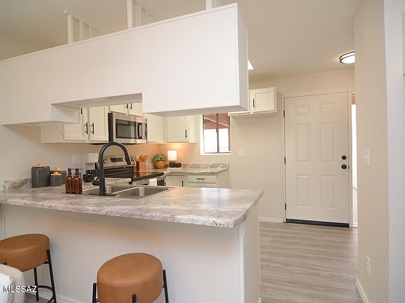 Beautifully remodeled Townhouse. Block construction. Located in a convenient East Tucson Location. Rich wood look LVP flooring. Remodeled kitchen with SS appliances. New interior paint. Updated modern bathrooms. One car garage and carport. Spacious upstairs owner's suite features three closets and dual sinks in bathroom. Charming HOA offers pool, spa, common area maintenance. New light fixtures and door hardware. This home shows beautifully.