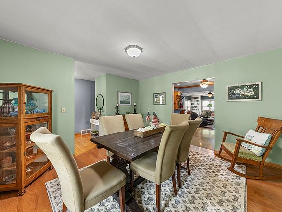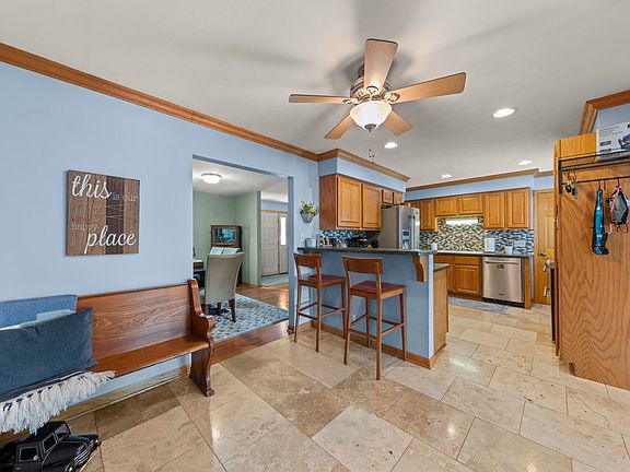 Welcome Home!! This 3 bed, 2 bath waterfront property has the perfect feel of a vacation home with total relaxation and amazing year-round backyard views. Entering the home, you are invited by beautiful hardwood throughout most of the main living areas. Step down into the sunken family room where you will be welcomed with lots of natural light, as you gaze into the large peaceful backyard with a beautiful view of the pond. The family room is adorned with wall-to-ceiling solid wood built-ins, crown molding, and wainscotting giving the spacious room character. Not to mention the warm and cozy feel of the gas limestone fireplace on the cold wintery days or nights as you enjoy a nice cup of hot cocoa. The updated kitchen features newer Maytag stainless steel appliances, laminate countertops, newer backsplash, breakfast bar and travertine tile. All bedrooms are carpeted with 6-panel solid wood doors, ceiling fans as well as offering you plenty of space. The main floor bathroom features white subway tile paired with a pedestal sink and jacuzzi tub. Head on down to the finished basement with faux wood ceramic tile, wainscotting, full bathroom for a possible separate living area. This area can also be used for entertaining your guests with a full-service wet bar, family movie nights or hosting sports events and watching the game in your personal home theater. You'll also find that with all that, there is still plenty of space for storage and a laundry room tucked away in its own separate area. Take yourself outside to the large deck area perfect for summer barbecues or stroll down the flagstone pathway to the brick paver patio with a firepit perfect for the bonfire nights and enjoy your smores, watch sunsets, and enjoy the fountain before it is shut off for the evening, or wake early and enjoy a tranquil moment out on the pedal boat while you greet the morning sun as it rises admiring wildlife. If the pond isn't enough nature for you, the home is a short distance to the Fox River where you can walk / bike/ rollerblade the trail or go fishing while still conveniently located near Fox Bend Golf Course, entertainment, fitness center, recreation center, shopping, and schools! Why wouldn't you want to make this waterfront property your personal oasis?