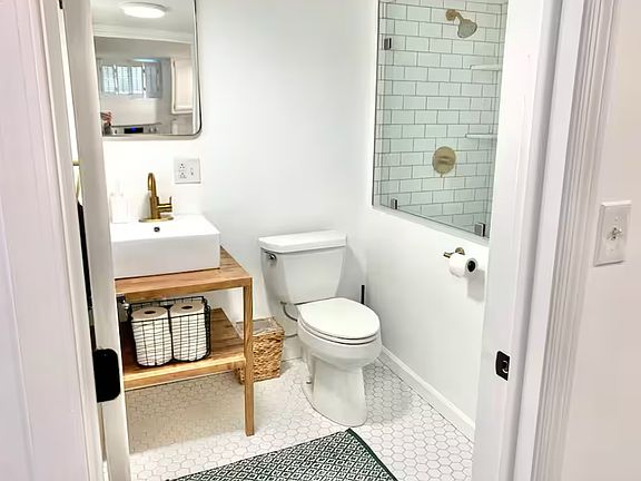 The entrance to the unit is located at the back of the house down 4 steps. The unit includes a spacious, fully stocked kitchen with sink, microwave, toaster, cooking utensils, keurig machine, baking pots and pans, silverware, dinnerware, refrigerator and freezer.