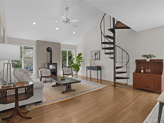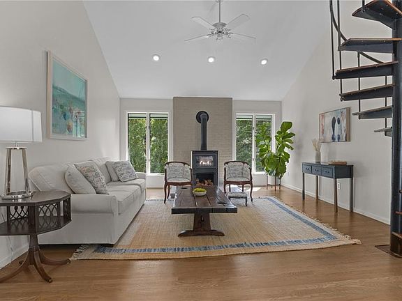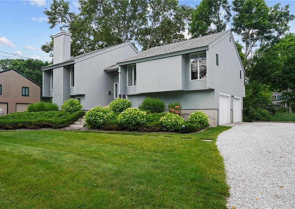 Welcome to 49 Riverside Dr, Barrington, a stylish, contemporary home along the river in Barrington's sought-after Country Club Plat neighborhood. Enjoy turn-key condition and sunlit spaces within this three-bed, two-bath residence. Enjoy an open floor plan with expansive cathedral ceilings in the living room and primary bedroom. The primary boasts a renovated en-suite and a private balcony with tranquil water views. Two generous bedrooms and an updated full bathroom complete the bedroom wing. Entertain in the living room with a focal fireplace and tap into an ideal office space in the dreamy loft above! It is well suited for a sought-after artist studio or home office. Gleaming hardwoods and striking light fixtures, including a George Nelson pendant in the foyer, add elegance throughout this uplifting home. More living opportunity awaits in the recently upgraded lower level, boasting a finished family room and a lower hallway fitted with large, customized closets, ideal for corralling coats, boots, and more! Benefit from a new oil tank, oversized two-car garage, central air, recent interior and exterior painting, a professionally improved and maintained yard and garden area, and access to the Barrington River via your backyard! Seize prime proximity to the town center to enjoy a morning coffee from Starbucks, lunch from Plant City, stroll to the library, or hit the East Bay Bike path, all from your stunning Contemporary in the Nayatt School District in Barrington.