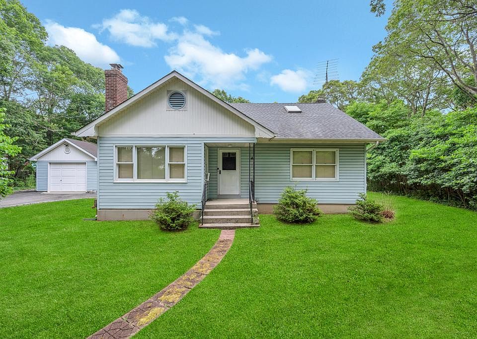 Nestled Exp Cape on 1 acre of property - Exp in rear of home. Located just north of South Country Road. Very private setting. Home is set back with detached 1.5 car garage/attached 10 x 15 storage shed. Polished Hardwood Floors throughout, large Livingroom w/ hi-hat lighting with wood burning stove & red brick base and new ceiling fan, Dining Room with slider to 27 x 14 wood deck in secluded yard, Kitchen with side door entrance- New Stainless steel refrigerator, SS Dishwasher and stainless steel sink and faucet , 4 Bedrooms nice size- one upstairs w/ skylight, raised panel doors throughout, Belgium block driveway- black top an 2 drains. Newer Peerless Heat System (5 years), 200 Amp Electric Panel, updated light switches and outlets on main level, freshly painted. Full basement with inside access and outside bilco doors. LG Washer And Dryer (6 mos) Home is Move in Ready!!!