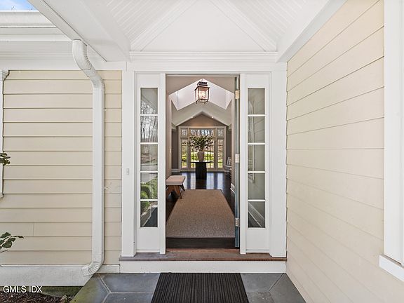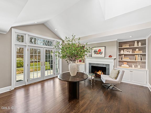 Step into a world of light and space as soaring ceilings and expansive windows welcome you into this tastefully renovated home, nestled on a quiet cul-de-sac in Greenwich's coveted back country. Set on four lush acres, this residence offers privacy, elegance, and effortless indoor-outdoor living. The dramatic vaulted entryway leads to a gracious living room anchored by a cozy fireplace, and a formal dining room both framed by French doors that open to expansive bluestone terraces. At the heart of the home, the sun-filled gourmet kitchen features a large quartz island, custom cabinetry, and a generous eat-in banquette-perfect for casual gatherings. The kitchen flows seamlessly into the vaulted family room, where a striking stone fireplace and custom built-ins create a chic and inviting atmosphere.