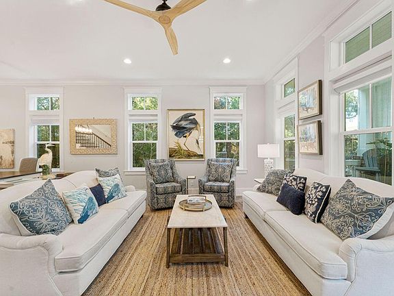 - Exterior features: Balcony, Columns, Rain Gutters, Outdoor Shower, BBQ Pit/Grill, Dock