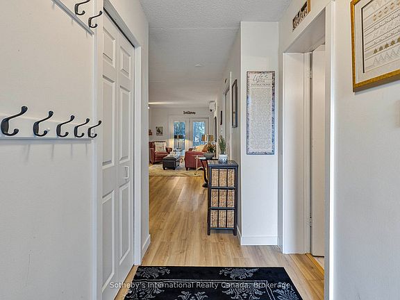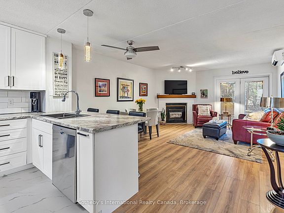 Fully Renovated ground floor 2 bedroom, 2 bathroom condo. Enjoy a short stroll to the shores Georgian Bay and the Collingwood Trail system. Walk or ride directly to Downtown Collingwood from your front door. Minutes away from area ski clubs and golf resorts and shopping. Features included beautiful new open plan kitchen cabinetry, counters and new flooring throughout the whole unit. Both bathrooms benefit from new cabinetry and floors. Baseboard heaters have been upgraded throughout the whole unit. New front door replaced in 2023. Freshly painted, this spacious condo offers an open plan concept featuring dining area and living space with cozy gas f/p and doors to private patio. This unit features a good sized second bedroom which could also double as an office/den. In unit laundry makes this an ideal full time home or fantastic weekend retreat with allocated parking bright outside front door.