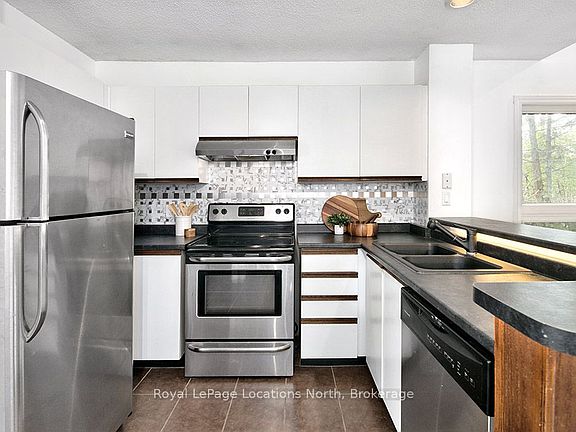 Bright & Private Condo Near The Blue Mountains! Discover this well appointed 2-bedroom, 2-bathroom condo ideally located just minutes from the ski hills of The Blue Mountains, downtown Collingwood, and the shores of Georgian Bay. Surrounded by mature pine and spruce trees, this home offers the perfect blend of natural light and privacy. Inside, large windows fill the open-concept living space with sunlight, while the natural gas fireplace adds warmth and charm. The kitchen and living room flow seamlessly, creating an inviting space for entertaining or relaxing after a day on the slopes. Two updated sliding glass doors lead to a spacious upper-level patio - perfect for enjoying outdoor living in the warmer months. The upper level is dedicated to a serene primary suite, featuring a bright 4-piece ensuite, oversized windows, and a skylight that bathes the room in natural light. The convenient laundry room includes a brand new stackable washer and dryer. Whether you're looking for a full-time home, weekend getaway, or investment property, this condo offers the ideal Collingwood lifestyle - close to nature, recreation, and everything the area has to offer. Reach out to Maggie or myself today to book your personal viewing and experience it for yourself!