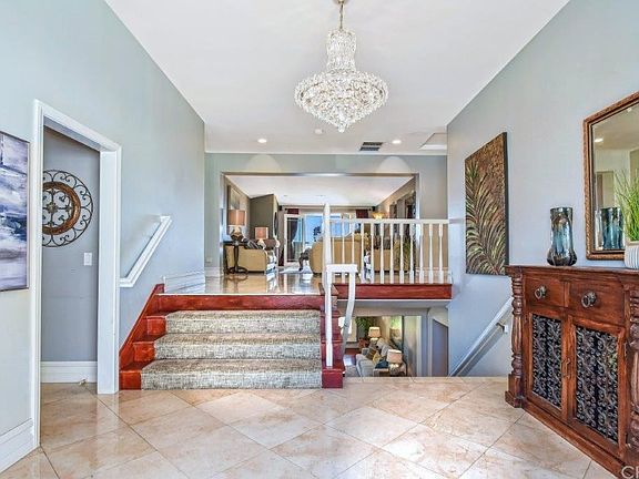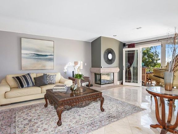 This absolutely gorgeous view home is ideally located on a quiet cul-de-sac in the sought after Rancho Palos Verdes community of Wallace Ranch. The beautiful executive home features a formal double door high ceiling entry that leads just a few steps up to the entry level and down to the ground level. The entry level is dressed with luxury marble floors and boasts a bright living room with an inviting fireplace as well as a large formal dining room adorned with a sparkling chandelier. The gourmet kitchen with 3 ovens, 2 dishwashers, double door fridge & Viking stove opens to a family room with a casual dining area & a cozy fireplace. The spacious master bedroom suite on this level is private and comfortable with its own fireplace, retreat/office, walk-in closet and 2 mirror wardrobes. The master bath features spa tub & a large shower. There is also a guest bedroom that can be used as an office, conveniently located near a guest bathroom. Most entry level areas open to a large veranda deck for relaxing & entertaining with a view of the ocean, sunset and backyard. Completing the entry level is a powder room and a laundry room. On the ground level are 3 additional bedroom suites each with their own bathroom, a 2nd family room with the 4th fireplace, and opens to the lovely covered porch & backyard with 9 different mature fruit trees. This home is close to schools, shopping & the South Bay; you certainly donât want to miss.
