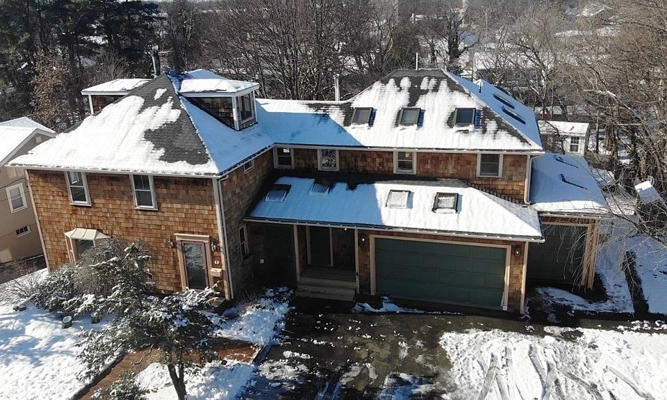 This is your dream home! Look no further for natural light as you'll count fifteen skylights throughout the entire house, six glass sliders, and dozens of windows. The primary suite can also be used as an in-law suite if needed and boasts cathedral ceilings, a wood burning stove, wall to wall tile bathroom with jacuzzi tub, and a balcony overlooking the Koi Pond and stream in the backyard. The kitchen was recently renovated with skylights, backyard views, butcher block countertops, and new stainless steel appliances. Renovated half bath with a laundry station and skylight. The 3 bay heated garage has two sliders to the backyard and can easily be used as a workshop. Extra large living room dining room with chandelier and wood burning stove as well as a large office with exposed beam high ceilings. The backyard has a natural stone Koi Pond, shed, and stairs down to a waterfront stream area for relaxing by the firepit. Spacious semi-finished basement. 15 min drive to Boston. Will not last