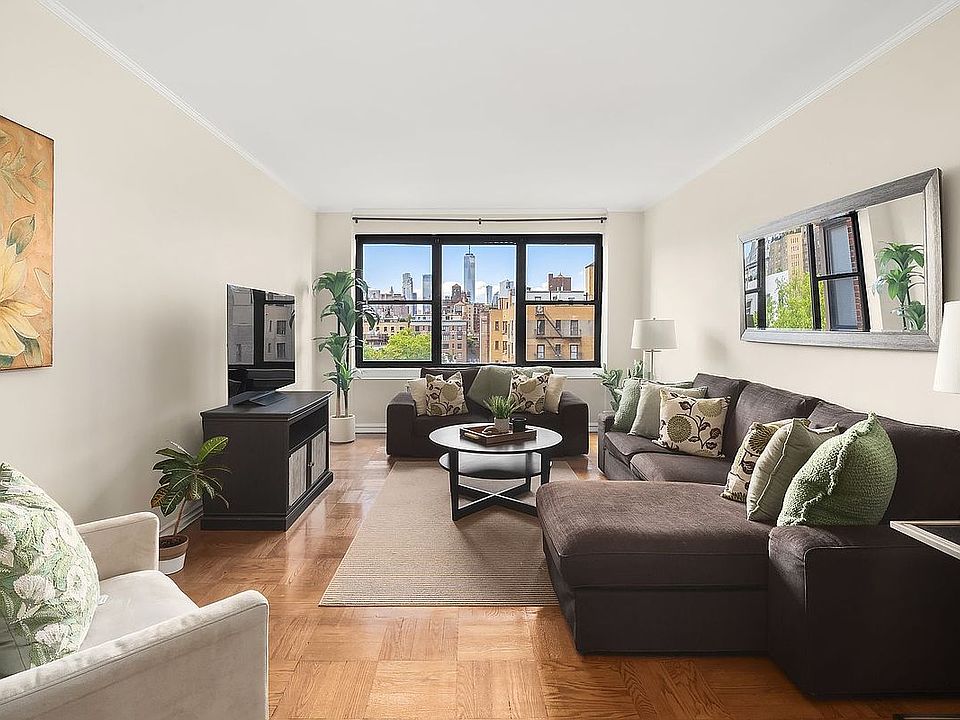 BEST VALUE IN GREENWICH VILLAGE-WON'T LAST! On a premier Gold Coast tree-lined Greenwich Village block, this rare, top floor, sun filled with gorgeous south views to Freedom Tower and downtown Manhattan 2 bedroom / 2 bathroom home resides in 49 West 12th Street, a highly sought after white glove mid-century (built 1952) full service cooperative building. Located in the Greenwich Village Historic District, features of this mint move-in ready home include a large living/dining room with a quiet southern exposure, a beautifully renovated eat-in-kitchen with Samsung & LG stainless appliances, pantry storage, white cabinetry, white ceramic tiled backsplash, grey Ceaserstone countertops, and quiet north exposure with open city views. A separate bedroom wing includes a generously proportioned primary bedroom with south exposure, a custom oversized closet and an en-suite renovated windowed bath with a glass-enclosed shower, white marble patterned oversized porcelain tiled walls & dark grey porcelain flooring, a second bedroom with a walk-in-closet and quiet and open north Greenwich Village views, and an adjacent hall bathroom with oversized porcelain marble tiling, dark grey porcelain flooring, soaking tub and white Ceaserstone topped floating vanity. Gorgeous light and wide open views from every window, refinished oak parquet flooring throughout, picture windows in the living room and primary bedroom, baseboard and crown moldings, radiator enclosures in all major rooms, and pet and pied a terre’s allowed with board approval completes this truly hard to find top floor Greenwich village home. BLD: 24 hour doorman, resident superintendent, full-time porter, landscaped and furnished roof deck with gorgeous Greenwich Village views (only one flight from the apt!), laundry room, bike room & private bin storage, Best GV location, near the Union Square Farmers Market, Union Square Park (Evelyn’s Playground), Washington Square Park, Meatpacking District, best grocery options (Trader Joes/Citarella/Whole Foods/Westside Market), GV Equinox gym, fine dining, boutique shopping, and numerous subway / bus options.