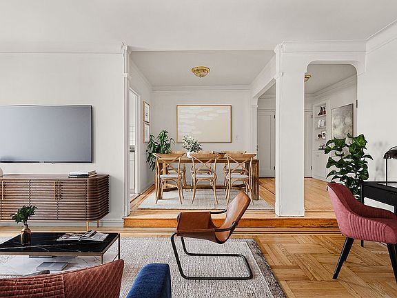Featuring sun-flooded views from every room (including a windowed kitchen and bath), this quiet, northern-facing home offers the original inlaid oak parquet floors, pre-war moldings, arched entryways, a separate dining area adjoining a welcoming foyer with a built-in shelved nook, a sunken living room, an extra large bedroom that will accommodate a king-sized bed, and four substantial closets. This spacious apartment, which awaits your decorative touch, is truly the paragon of a classic Upper West Side pre-war home.