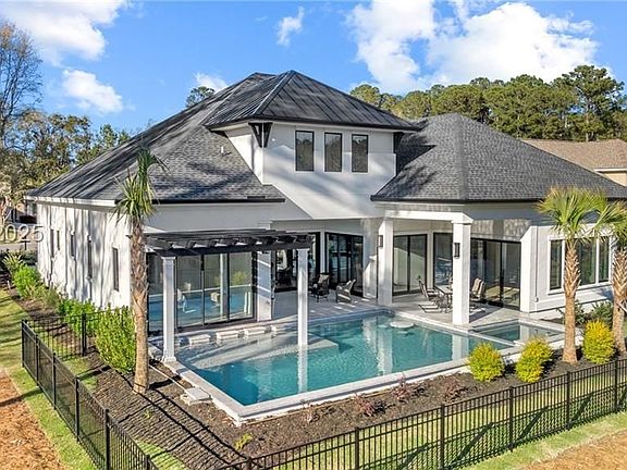 Experience effortless luxury in the heart of Bluffton's private golf community of Hampton Hall Club, just minutes from Hilton Head Island. This breathtaking oasis is a masterclass in blending modern/farmhouse indoor living with expansive, beautifully designed outdoor spaces for entertaining on a grand scale. Designed for versatility and style with multiple flexible spaces, this property offers unique opportunities for customization and convenience.