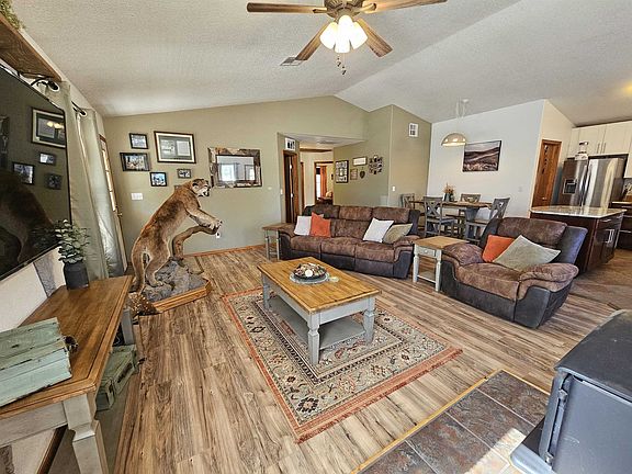 Very nice well maintained home nestled in the desirable Twin Forks area. Lot is fenced with chain link and also has a two car garage/workshop. There is a large drive with plenty of parking. Home backs up to a forest of beautiful pine and boasts handicapped accessibility with a long ramp on the side. Lovely hardwood flooring and tile throughout . Kitchen has a large island and the living room has a nice stove to keep your gatherings warm in the evenings.
