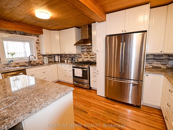 Steps to Georgian Bay, the Trans Canada Trail access & a waterfront park. Move in ready, 3 Beds on ground level, 1.5 bath, open concept main floor, beautiful cathedral ceiling, updated kitchen w/quartz counters/island & custom cabinetry, living rm, dining area, work area and small loft, step up to a 16x30ft. family room w/gas fireplace. There is an oversized heated double garage, walkout deck, 24 ft. above ground pool. April 2022 new Furnace, A/C & Fireplace, natural gas BBQ hookup at patio doors.