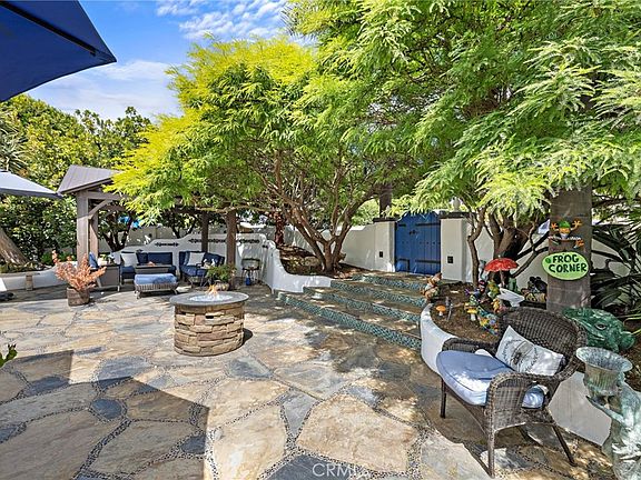 Discover this enchanting storybook cottage nestled on a quiet corner lot in the sought-after Woods Cove area of Laguna Beach. Situated at the top of Agate Street away from the busy beach traffic, loud cars and parking at all hours, very quiet and tranquil. High up enough to get ocean views, but close enough to be on the sand in minutes. Framed by graceful shade trees and towering palms, the property welcomes you with a gated flagstone patio leading to an entertainer's haven featuring a charming gazebo and expansive side yard. Tree top ocean views from second story. This Beach cottage comprises 3 bedrooms and 2.5 baths, exuding warmth with its vintage details, vaulted wood ceilings, exposed beams, and stained glass accents.