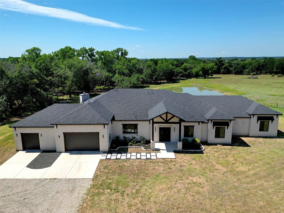 COUNTRY OASIS LOCATED ON 1.5 HEAVILY WOODED, PRIVATE ACRES W-POND VIEW*UPSCALE COUNTRY LIVING W-QUIET, PRIVATE SECLUSION*SHOWS LIKE NEW*BUILT 2022*BARELY LIVED IN*3959 SQ FT LIVING*OUTDOOR IS 1443 SQ FT, GARAGE IS 1,022 SQ FT W-DRIVE-THRU DOOR*2 OUTDOOR FIREPLACES & 38 X 16 PATIO*HIGH END FINISHES*POLISHED CONCRETE SHINES LIKE MARBLE*ANDERSON WINDOWS, KC-KANSAS CITY METAL DOORS, FRONT & BACK DOORS OPEN*ELECTRONIC SCREENS*PERFECTLY FOR SEPARATE GUEST SUITE FOR MULTI GENERATIONAL LIVING*OPEN FLOOR PLAN W-GREAT RM LINEAR FIREPLACE & CUSTOM BUILT-INS*NO HOA*STUDY*MEDIA*BAR RM*3 BED*3 BATHS*SEPTIC*CITY WATER*PLUMBED FOR WELL*ONE STORY*RV HOOKUPS*GOURMET KITCHEN W-ALL MONOGRAM APPLIANCES, SUB ZERO, 2 DISHWASHERS, HUGE UTILITY-MUD RM W-SHOWER*KC ACCORDION KITCHEN WINDOW FOR OPEN AIR LIVING*HORSES PERMITTED*ADDITIONAL ACREAGE AVAILABLE FOR SALE*22 MILES TO FORT WORTH STOCKYARDS, 24 MILES TO DOWNTOWN FORT WORTH*SEE AMENITIES ROOM-BY-ROOM DESCRIPTION, 360 & DRONE VIDEO SET TO MUSIC