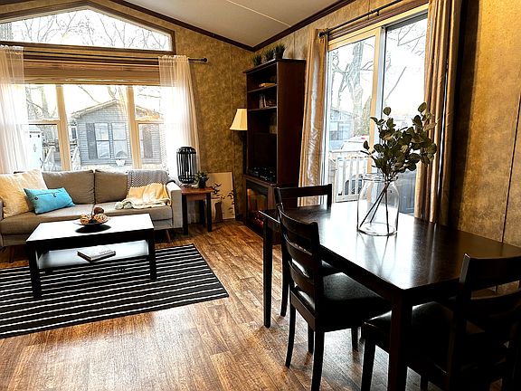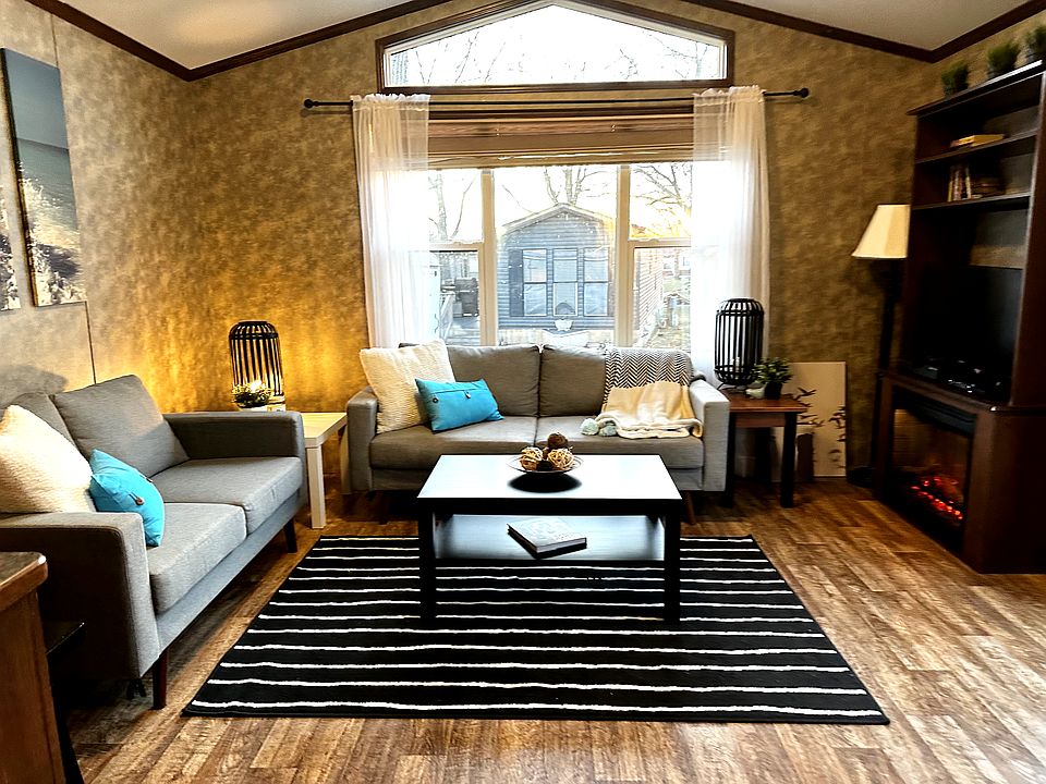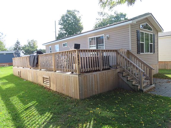 Welcome to Evergreen Village #43! This newer model 3 bedroom cottage is located close to the Funplex, sports courts, convenience store and laundromat! The brand new deck is perfect for family gatherings, and steps down to a side yard with no direct neighbours! Gather around the interlock fire pit with your family and friends. The kitchen, dining and living room are all open and spacious in this 14' wide cottage! The fireplace completes that quaint and cozy feel! Bunk beds in the second and third bedrooms, a pull out couch in the living room, and a queen sized bed in the primary bedroom means room for the whole family after a fun-filled day around the resort! Contact the Sherkston sales team today to book your appointment to view this Evergreen Village cottage!