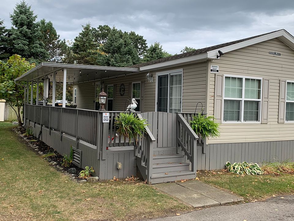 Welcome to Evergreen Village #52! This rare 16' wide cottage is a RARE find in Evergreen Village! Spacious with no rear neighbours, this cottage has 2 bedrooms, 2 full bathrooms, stackable washer and dryer, and a covered deck to enjoy outdoor living. Updated flooring throughout, quartz countertops with new sink with the kitchen. Spacious dining area. Large living room with double couches, fireplace, and sliding doors out to the deck. Primary bedroom has full ensuite with enclosed shower, large walk-in closet with laundry units. Located in a great neighbourhood, quiet and yet walking distance to resort amenities. Contact the Sherkston sales team to view this must-see in Evergreen Village today!