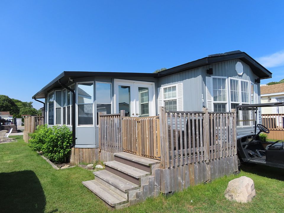 Welcome to Ledge Lane #19, where you can sit on your deck with views of the lake, without the waterfront fees! WALKING DISTANCE TO ELCO BEACH! This completely renovated 2 bedroom cottage is all open concept with the large living room open to the kitchen and dining area. Bright, spacious, and move-in ready, you and your family can start enjoying cottage life at Sherkston this summer! Updates include new flooring, updated bathroom with walk-in shower, updated light fixtures, and outdoor shower. Contact the Sherkston sales team to book a tour of this turn-key beach house!