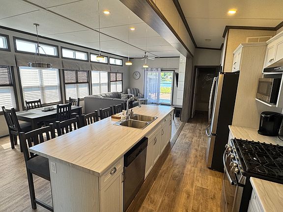 Located in the newly completed community of Quarry Meadows backing directly on to the pond is this gorgeous 3 bedroom, 2 full bathroom 994sqft double wide! With a full open concept livingroom, kitchen and dining room you'll enjoy entertaining family and friends with seating up to 12! The master suite boasts a king bed with his/her closets and a full ensuite. Round that off with a bunk bed room and a double bed room and a pull out couch in the livingroom and you can sleep 8 comfortably! Outside you'll enjoy plenty of parking, a full 100sqft shed with power and lights, a huge rear deck and patio area with firepit overlooking the pond. These sites are VERY coveted within the Resort - don't miss out on this one, book a tour today with a Sales Team member.