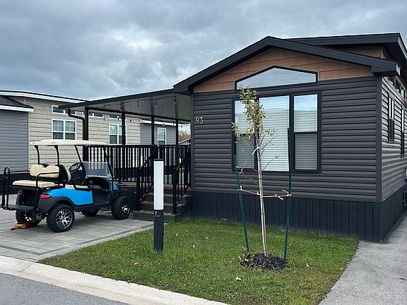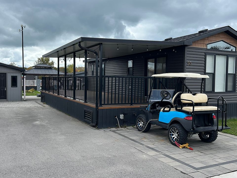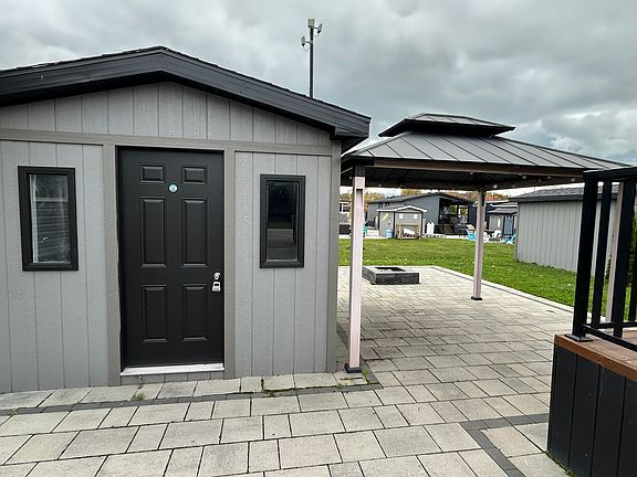 Quarry Meadows #93 This beautifully maintained 14' wide, 2-bedroom cottage is ideally located near the Owner Pool and just a short walk to the Quarry. Inside, you ll find a bright open-concept living area with vaulted ceilings, large windows, and a cozy electric fireplace. The kitchen features wood grain cabinetry, stainless steel appliances, backsplash, and plenty of counter space. The spacious deck (12x37) with a 13x20 hard awning offers the perfect spot for outdoor relaxation or entertaining. The bedrooms include a primary with ample storage and a second room with bunk beds. Outside, enjoy the landscaped yard, fire pit area, and shed for extra storage. A quick golf cart ride takes you to the beaches on the lake or the Family Funplex everything you need for the perfect resort getaway!