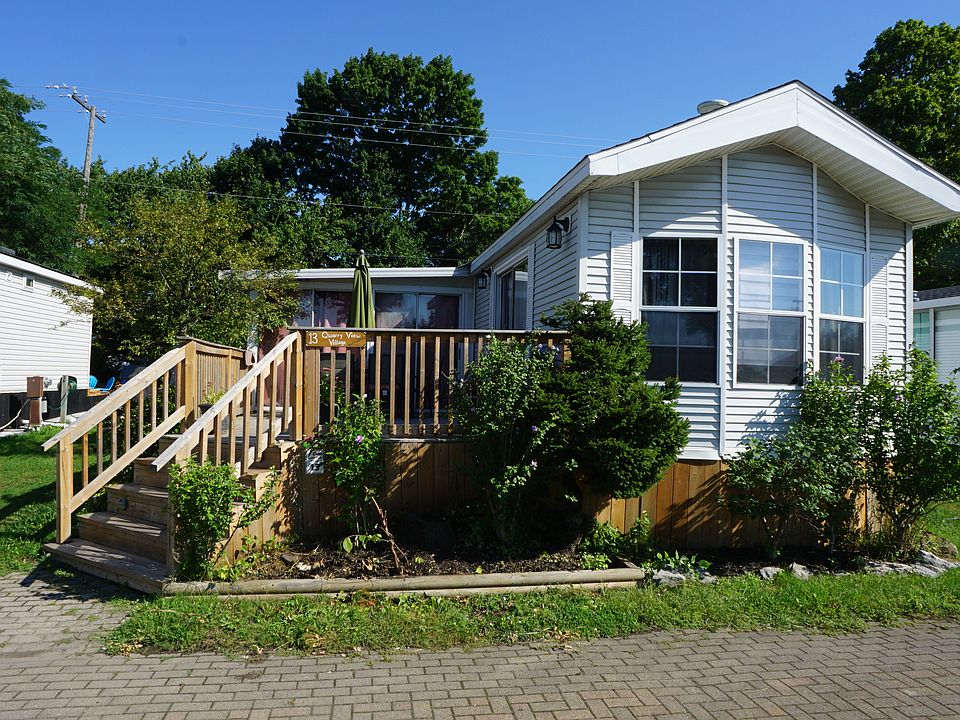 Welcome to Quarry View Village #13! On a large lot on the back row of Quarry View Village, this 2 bedroom, 1 bath Vacation Cottage has a ton of space for your family! The unique loft space gives you an extra sleeping area. The covered deck outback steps down to the spacious rear yard, complete with a storage shed and fire pit. The add a room is bright with large windows. This is a natural gas site, meaning no propane tanks to worry about. Recent updates include new roof (2022, new flooring, bathroom, and paint throughout. Contact the Sherkston sales team to view this move-in ready cottage!