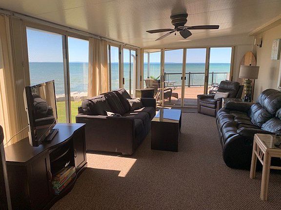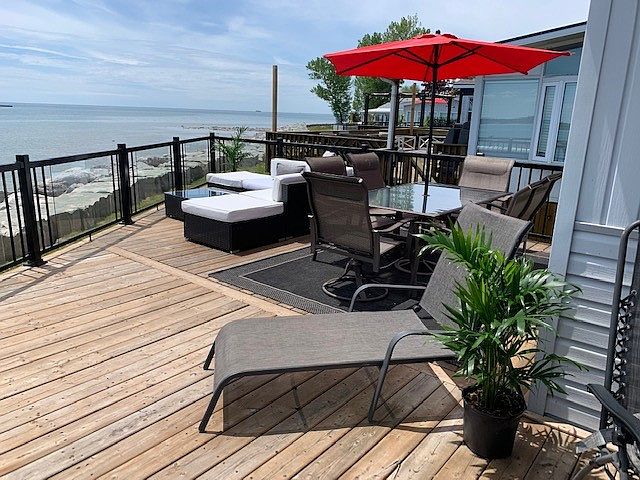 WATERFRONT! Welcome to Waters Edge #5! Located right on the shores of Lake Erie, enjoy the season with the best lake views in the resort! Wake up with the water outside your window in the primary bedroom and step out onto the large deck and take in those WATER VIEWS all day! Whether you're relaxing by yourself or entertaining friends and family out on the deck, you will hear the sounds of the lake and see the sun setting in the evening. With 2 bedrooms, 1 bathroom, spacious kitchen and dining area, and large living room, this cottage has it all and is move-in ready. Spend this summer on the lake! Contact the Sherkston sales team to book your appointment to view this beach house!