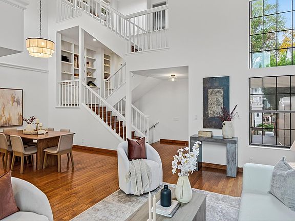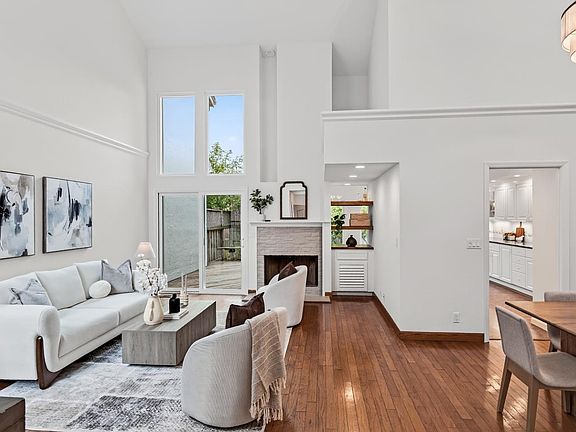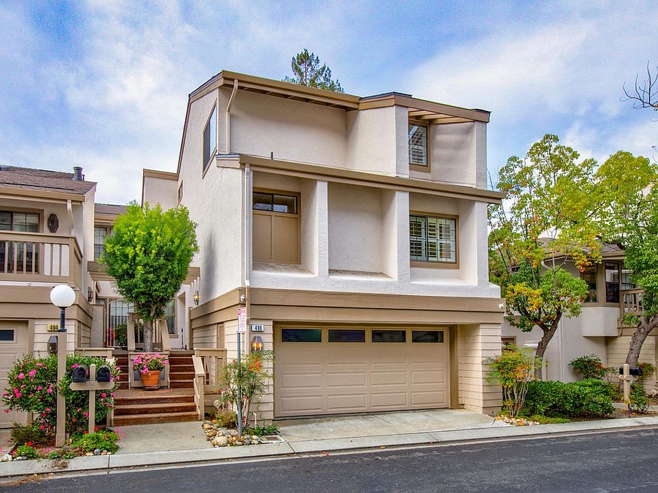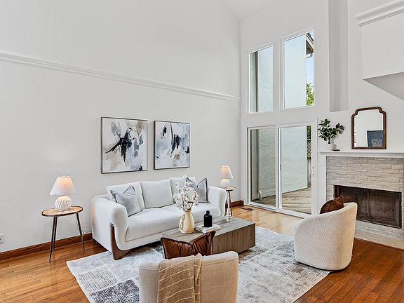 Set within a quiet and secure gated community in a prime Sunnyvale location, this stylish home combines soaring ceilings, incredible natural light, and a thoughtfully designed floor plan. A gated courtyard and covered entrance introduce the home, where rich hardwood floors extend throughout. The living room enjoys dramatic two-story ceilings, a painted brick fireplace, built-ins, and tall windows framing views of the private yard. The adjacent dining area is anchored by a two-tier drum chandelier and enjoys clerestory windows for added light, while the kitchen offers granite countertops, full-height tile backsplashes, a skylight, and quality appliances. A casual dining area opens to the lush backyard surrounded by tall perimeter trees, stacked-stone garden beds, a lovely brick patio, and a wood deck with built-in seating. Three bedrooms include the spacious primary with generous closet space and an en suite bath with dual vanities. Access to a community pool, hot tub, and barbecue area. A light and airy home with an ideal layout for family living and entertaining, moments from parks, schools, and top amenities.