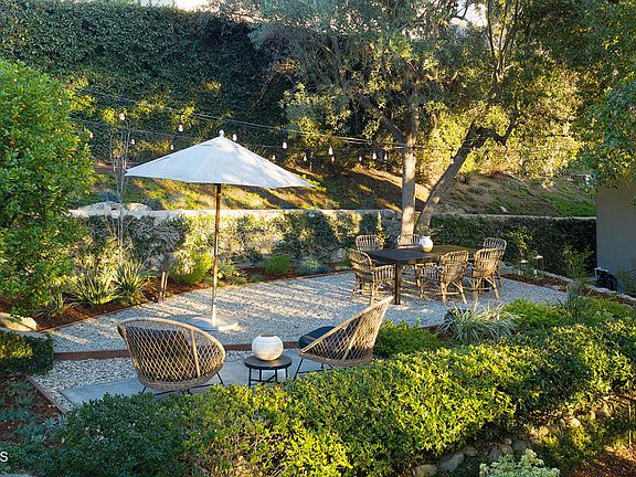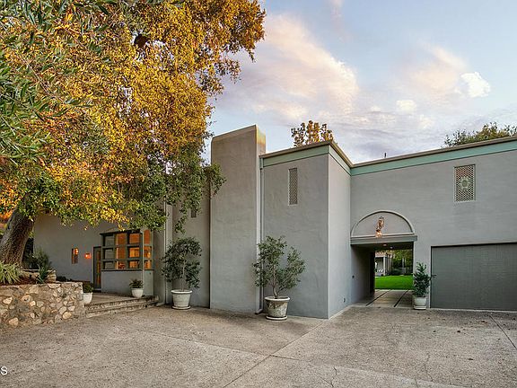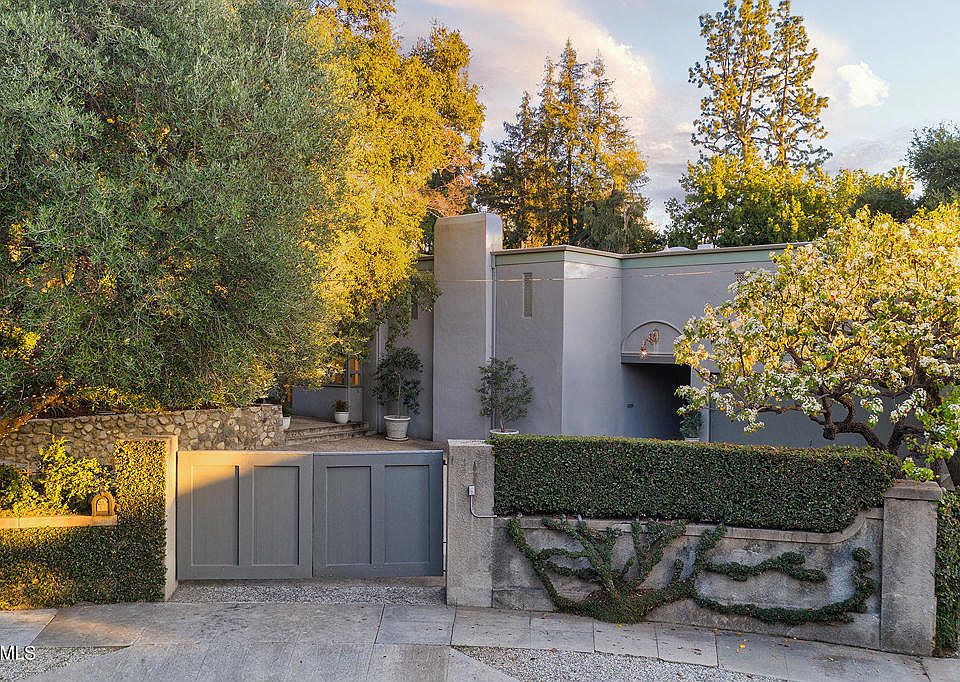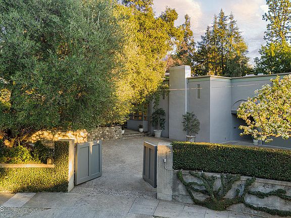 Striking Mid-Century Modern designed by architect Theodore Pletsch, renowned for his plethora of work in Pasadena and the surrounding Los Angeles environs, this perfect setting immediately conveys an air of noble sophistication. Located just off Millionaire's Row at the top of wooded La Loma Road and sited behind the privacy of large imposing gates, Pletsch designed the estate in 1967 in collaboration with decorator and mid-century interiors retailer Jean Crowell and her husband Eugene. In 1978, while marveling over its unique and enduring architectural style, the Los Angeles Times affectionately crowned it The Crowell Residence. The journey begins at a walled courtyard and leads to an entry passage that at once reveals a serene one-of-a-kind secret retreat. Distressed double doors open to a dramatic double-height LR and adjacent DR featuring three-sets of over-sized glass doors that open to a majestic plein air landscape of gardens - formal in their structure with Mediterranean plantings, a Greco-Roman designed swimming pool and numerous landing pads in which to luxuriate. The 1-BR guesthouse with a LR, kitchen and 3/4 bath sits prominently as it effortlessly draws the eye over the sparkling pool, to the cascading hillside and sky beyond. Timeless in design, the sleek buildings offer scale and a sense of place and feature massive pillars, textured smooth stucco walls and small windows accented with ornate metal screens reminiscent of a Moroccan or Medieval Villa.