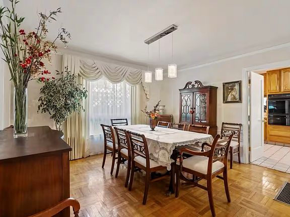 - Formal dining room with large table that seats 8-10 people with matching credenza & buffet table