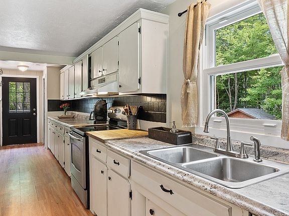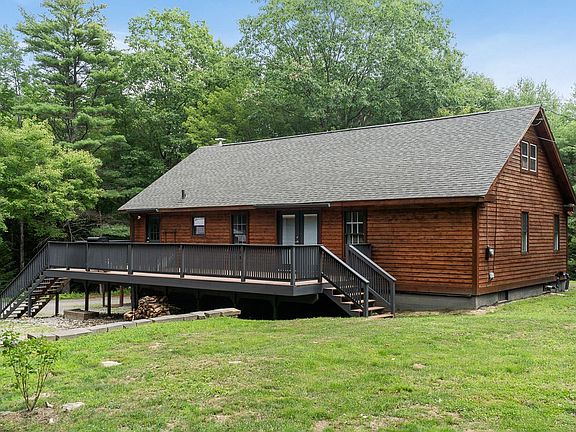 Relax and Enjoy the Tranquil Setting of this Charming Cape.This Warm and Inviting home features an Open Plan Country Kitchen, Dining area and Sunlit Living room with a fireplace overlooking the sprawling front yard. The First Floor Bedroom and Full Bath with Laundry complete the First Floor. There are Two additional spacious bedrooms upstairs with access to attic/eaves for more storage. To complete this home, there is a partially finished basement with a Family/Game Room. Relax on the expansive Farmers Porch or BBQ on the back deck. Private backyard, Ample parking and one car garage and Tent for all your toys.