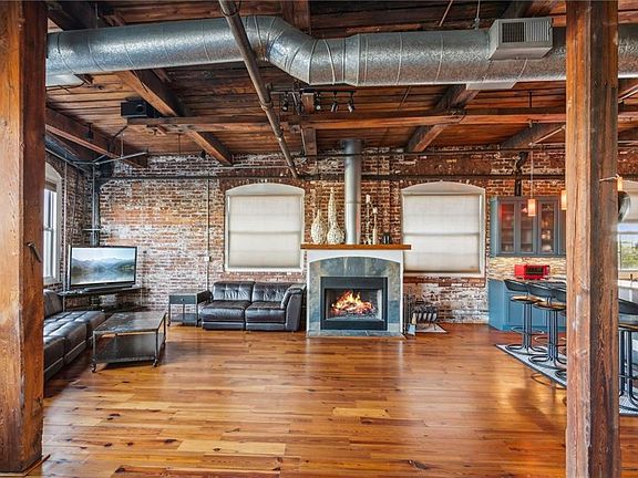 Wood-burning fireplaceElegant tile workStunning skyline viewsBreathtaking panoramic viewsSoaring wood-beam ceilingsOpen concept designExposed ductwork