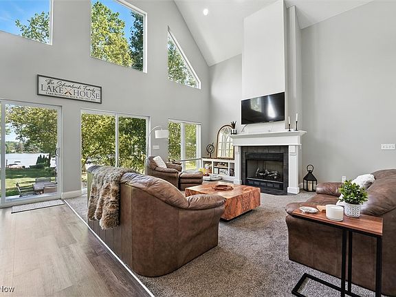 This breathtaking 2-story lakefront retreat combines modern design with cozy comfort and sweeping water views. The dramatic great room features soaring 2-story floor-to-ceiling windows, an open-concept kitchen, and a gas fireplace, all overlooking the beautifully landscaped yard that gently slopes to the lake.