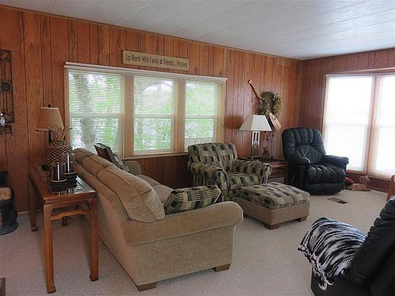 This lake property features 100ft lake frontage with sandy beach, boathouse with deck, storage shed, paved driveway and a 165ft deep well. The 16x80 Mobile Home has open floor plan with large windows to Lake front. 3 bedrooms and 2 baths. Central air and water softener. Large lot with lots of parking and room to build a garage. Property has newer roof, windows, siding and exterior doors. Also three decks and very beautiful lot.