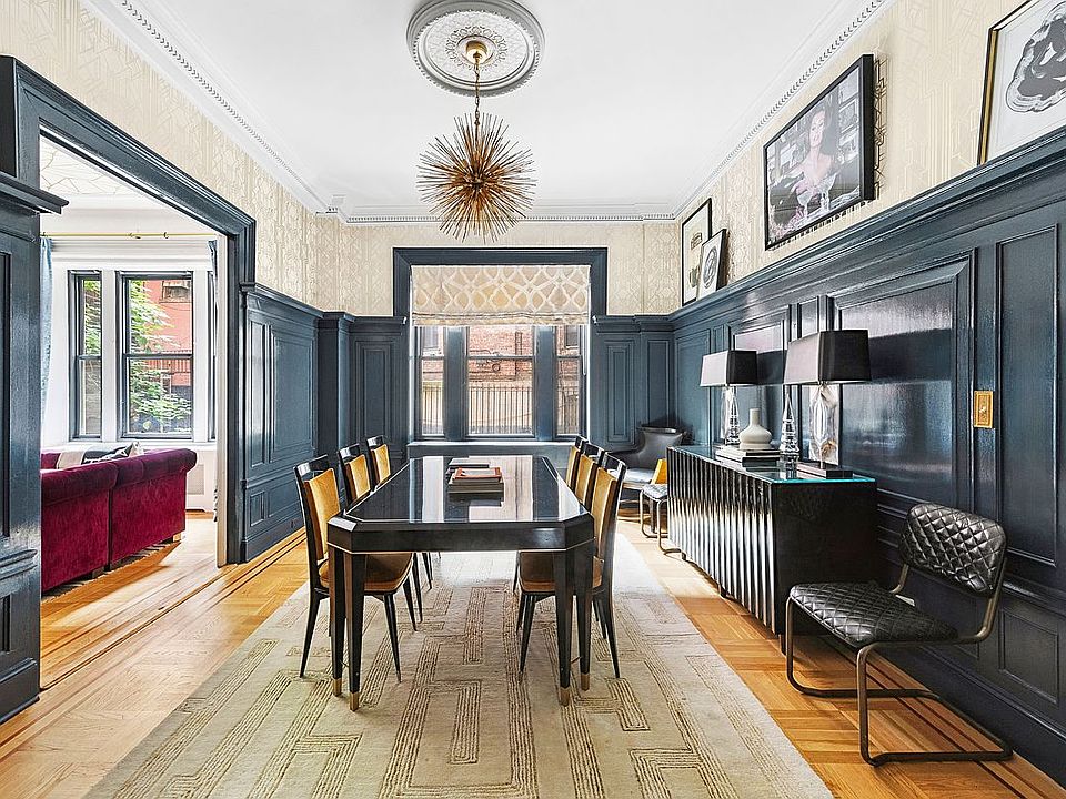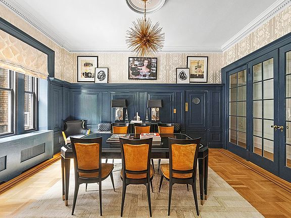 The expansive, wood-paneled formal dining room is a showpiece, featuring a decorative fireplace mantel crowned by an intricately filigreed mirror. Rich oak parquet floors with mahogany borders and dramatic 9-foot French doors underscore the apartment’s sophisticated style. Throughout, picture-frame walls, custom tile work, and large wood-framed windows evoke the grace of a gilded age home.