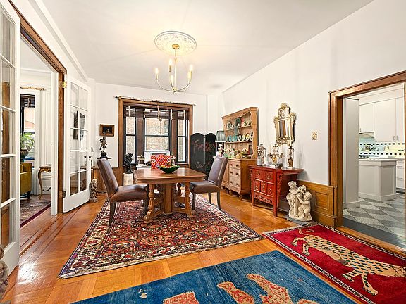 Inside this expansive home of approximately 2,000 square feet, soaring coved ceilings rise above inlaid parquet floors, intricate molding, handsome millwork, and oversized windows facing east and south. An oversized foyer makes a warm welcome with a coat closet and plenty of space for seating. Ahead, discover an ideal layout for relaxing and entertaining, including a spacious living room featuring a stately decorative fireplace. French doors open to the formal dining room, perfect for large gatherings under a classic ceiling medallion. The adjacent eat-in kitchen has been expanded into the traditional maid's room space to provide an inviting breakfast nook, a convenient guest bathroom, an in-unit washer-dryer and a windowed home office. Chefs will love the floor-to-ceiling cabinetry and stainless steel appliances, including a gas range, side-by-side refrigerator and dishwasher.