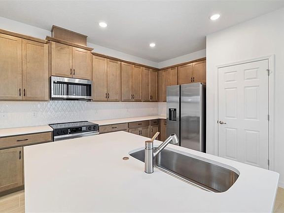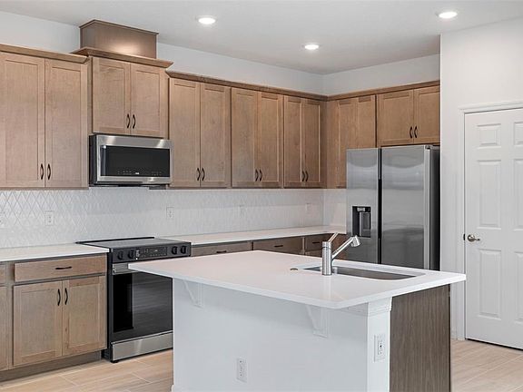 Welcome to the Skye plan — a beautifully designed 3 Bedroom, 2.5 Bath home featuring 9'4" ceilings on the first floor, durable tile flooring in the 1st floor main living areas, and a versatile second-floor Loft, perfect for work or relaxation. The open-concept kitchen is a standout, showcasing 42" cabinets with crown molding, quartz countertops, a stylish tile backsplash, stainless steel appliances, and a center island - great for additional prep space. The kitchen flows seamlessly into the living and dining areas and overlooks the private patio, ideal for outdoor enjoyment. Upstairs, the spacious Primary Bedroom offers a walk-in closet and a luxurious ensuite bath with dual sinks in adult-height vanity, quartz countertops, and shower with upgraded wall tile surround. Future Community amenities include beautiful Pool overlooking Lake Lucy, Cabana, walking trails, and 2 Playgrounds, with future shopping and retail within the Community. Cypress Bluff offers quick access to the Florida Turnpike, and conveniently located just minutes from downtown Groveland and Clermont.