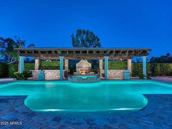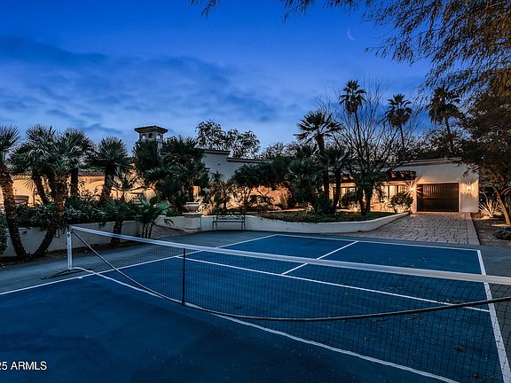This rare gem sits directly on the 6th green of the prestigious Paradise Valley Country Club. Nestled on a private, gated lot with lush landscaping and sweeping views of Camelback Mountain, this estate blends timeless elegance with the best of refined desert living. The residence welcomes you with soaring ceilings, expansive windows, and a flowing floor plan designed for both comfort and sophistication. A detached guest house with its own garage offers exceptional privacy for visitors. The chef's kitchen is equipped with premium appliances and a dedicated wine cellar, while multiple living and dining areas open seamlessly to the outdoors for effortless entertaining. The primary suite is a true retreat, complete with a cozy fireplace sitting area, gym, spa-inspired bath, generous walk-in closet, and private access to the backyard oasis. Resort-style amenities define the backyard experience, featuring a custom pool and spa, pickleball court, outdoor fireplace, and a full outdoor kitchen with island, sink, refrigerator, and built-in BBQ ideal for hosting family and friends year-round. Enjoy the exclusive lifestyle of PVCC with access to world-class golf, dining, tennis, pickleball, pool, spa, and fitness facilities. Just minutes from fine dining, luxury shopping, and additional golf destinations, this property offers the perfect balance of privacy and convenience in one of Arizona's most desirable neighborhoods. Don't miss the chance to call this Paradise Valley retreat your home.