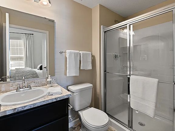 Vegas-style poolWhite trim and doorsFire pitOutdoor kitchenSleek black appliancesAbove-range microwaveGenerous closet space
